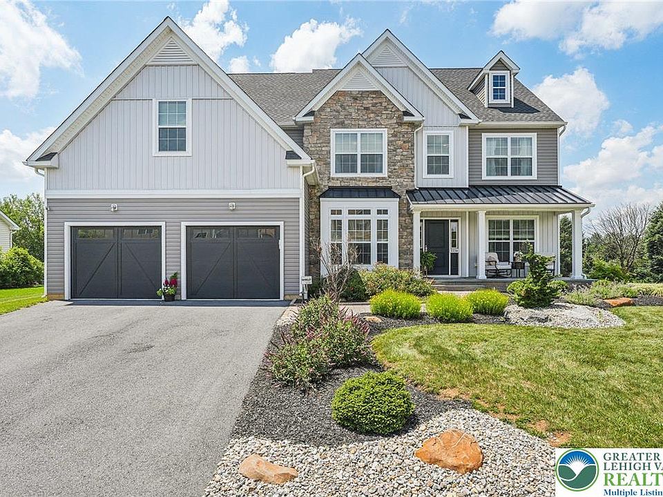 OPEN HOUSE CANCELLED. OFFER ACCEPTED.Nearly new Tuskes semi-custom home offering 5 bedrooms and 5 full baths, including a flexible first-floor bedroom with an adjacent full bath—ideal for guests, a playroom, or additional office/flex space. The heart of the home is a spacious eat-in kitchen with center island + seating, tiled backsplash, quartz counters, gas cooking, walk-in pantry, and access to the rear reception room to garage, outside patio, and dining room and opens to a dramatic two-story living room featuring a gas fireplace and a wall of windows flooding the space with natural light. A private office with French doors adds more work-from-home versatility. Upstairs, the oversized primary suite offers a lounge area, two walk-in closets, and an en-suite bath with dual sinks and a large glass-enclosed tile shower. A second junior suite includes its own private bath and walk-in closet, while two additional bedrooms share a full hall bath. Laundry is also conveniently located on the second floor. The partially finished basement includes a full bath, with a family room on one side of the stairs and an open hobby/rec/gym/flex space on the other—distinct yet connected. The oversized fenced corner yard offers a patio and firepit with views of the mountains. LVP flooring, recessed lighting, neutral finishes, and economical gas utilities complete this impressive home.