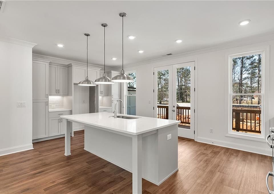 - Features: Breakfast Bar, Cabinets White, Kitchen Island, Pantry, Solid Surface Counters, Stone Counters, View to Family Room