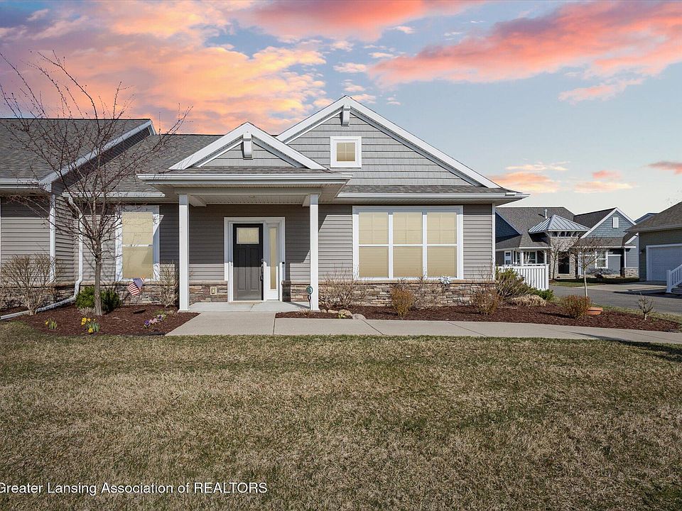OFFER RECEIVED> OFFERS DUE BY NOON ON APRIL 19. Meticulous 2 bedroom/ 2 bathroom condo located in the sought after Villas at Stratford Place community in East Lansing is now available!! Your new home is less than 10 years old and in pristine condition. It features an open floor plan with plenty of space for large gatherings with an abundance of natural light. Enjoy your gas fireplace on those chilly Michigan evenings. The highlights of the kitchen include the large quartz counter island, pantry and gas range. The primary ensuite boasts a spacious bathroom with double vanity quartz counter and walk in closet. The second bedroom and bath enjoy a private location away from the primary suite. Another bonus is the 2 car attached garage that opens into the mudroom for ease of entry. You will have access to the community center that you can reserve for your extra large gatherings, and enjoy the fitness center for your work-outs!