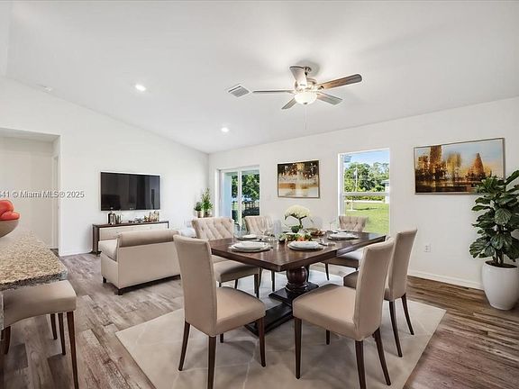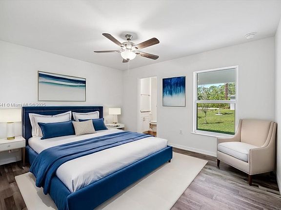 This stunning property features 4 bedrooms and 3 full bathrooms, boasting not one but two master suites! The expansive layout with a vaulted ceiling offers an ideal setting for entertaining. Enjoy the elegance of high-end shaker cabinets in the kitchen, complemented by plank flooring throughout. Stainless steel appliances add a touch of sophistication. Step out to a generous covered lanai overlooking the spacious backyard. Plus, benefit from a full irrigation system and the convenience of impact doors and windows, eliminating the need for shutters.