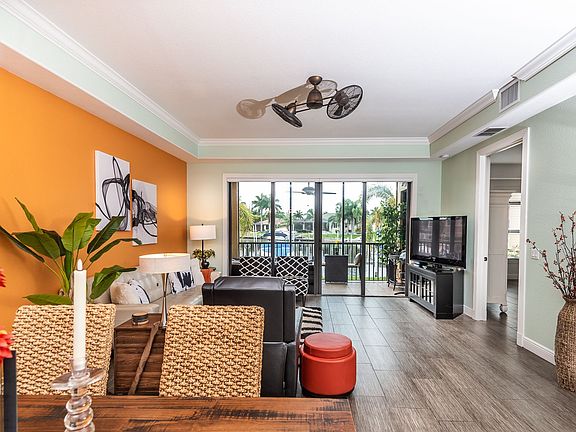 "SEASONAL / SHORT TERM RENTAL". AVAILABLE MAY 01, 2025. Enjoy your Florida stay in this luxurious, totally updated ground floor condo in Grand Bay of Punta Gorda Isles with a fantastic view of Sailboat Turning Basin. High ceilings, Granite counters, Wood cabinets, covered parking with storage space. Deeded dock #1 for larger boat and Sailboat access to Charlotte Harbor. Elegantly furnished. Expanded kitchen with breakfast nook and snack bar. Separate laundry room. Screened tiled lanai with a panoramic view and a heated pool also overlooks the water. The Lanai has a desirable Eastern exposure which gives morning sun and afternoon shade for your Maximum comfort. 12% taxes apply for all rentals of 6 months or less.