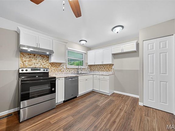 Move right in to this updated home featuring luxury plank floors, new carpeting, remodeled bathrooms, six-panel doors, freshly painted, and a refreshed kitchen with modern cabinets, counters, backsplash, pantry and appliances. Relax by the wood-burning fireplace in the family room, or enjoy the large, partially covered patio and fenced backyard for kids or pets. The property also includes low-maintenance brick and vinyl siding, enclosed soffits and facia, a newer sidewalk, and a one-car garage all located in the unincorporated St. Charles Hills subdivision.