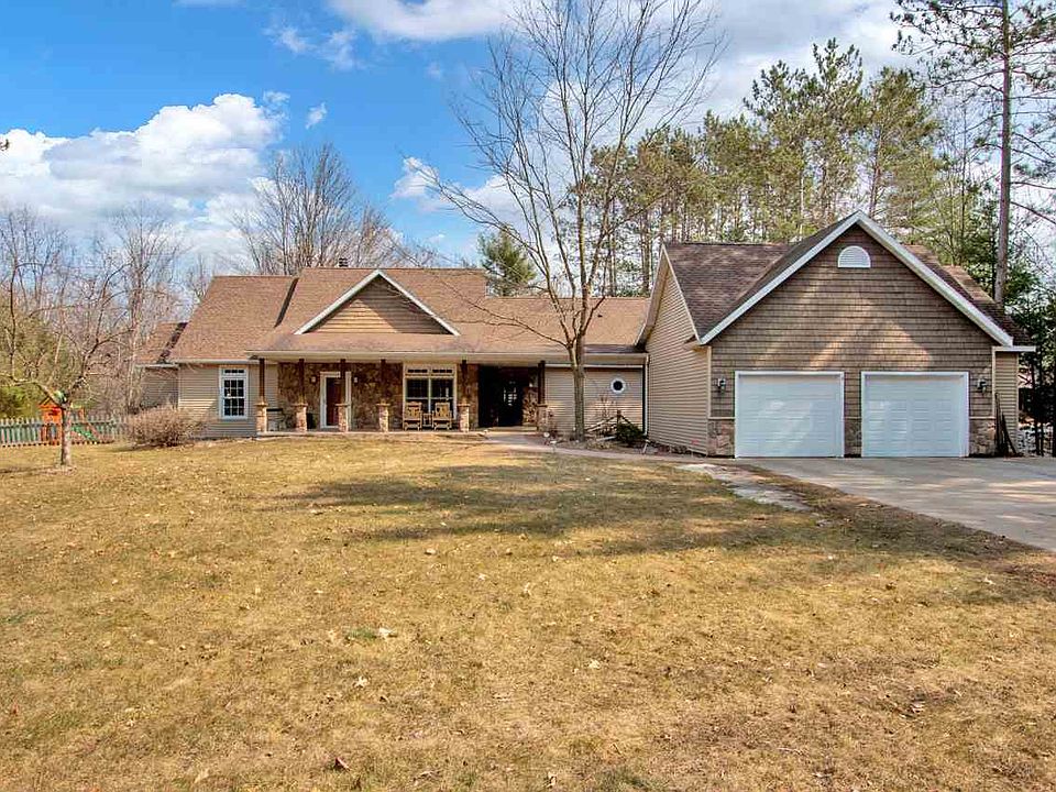 Private oasis just minutes from downtown Stevens Point. Modern ranch situated on a 1.36 acre parcel with panoramic views of Mill Creek. Numerous features provide a universal design and spacious floorplan. Enjoy tons of natural light throughout with an open floor plan. The main level provides two separate front entrances, two fireplaces, nine-foot ceilings, and French doors to separate dining room/office. Cubbies just inside the kitchen entry allow for the perfect drop zone and added functionality. The kitchen is accented by granite countertops, a 4-chair snack bar, and stainless-steel appliances. The master bedroom has an elegant sitting area with a 2-sided gas fireplace and cherry hardwood floors leading directly into the sleeping quarters. Massive en suite is complete with dual sinks and a walk-in closet. Two additional bedrooms on the main level are connected via a Jack and Jill bathroom. Downstairs provides multiple entertaining spaces with a large family room, media/theater retreat and kitchenette.Let's not forget about the 4th bedroom (non-compliant egress window) and additional half bathroom. Outside features include a 30x24 oversized garage, separate garden shed, stamped rear patio, and covered front porch. Enjoy nature at its finest in this sprawling retreat!!!