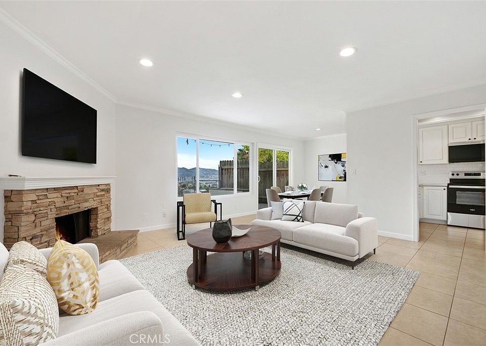 This pet-friendly, single-level 2-bedroom, 2-bathroom corner unit is a rare find offering a spacious enclosed yard, sweeping mountain views, and the convenience of all hard-surface flooring with no carpet! Just minutes from Dana Point Harbor, this 900-square-foot home features an open-concept layout with a modern kitchen, quartz countertops, a newer microwave, and stove. The primary suite includes two closets and plenty of natural light. The living room is warm and inviting with recessed lighting, a stacked brick gas fireplace, and sliding doors leading to the yard. Additional conveniences include washer & dryer hookups, a one-car garage, and one assigned parking space.