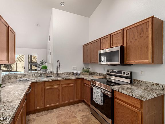 Fall in love with this adorable home in the gated Mountain View! Its inviting charm meets with its low maintenance ownership. The interior showcases abundant natural light, with all new fresh interior paint, travertine tile and vaulted ceilings that add to the airy feel. Designed for everyday living and entertaining, you'll love the perfectly flowing open layout, split floor plan paired with sliding doors to the back! The impressive kitchen boasts brand new sleek SS appliances, new granite counters with new single basin sink, disposal and a good size pantry. The large main bedroom has wood-look flooring, a walk-in closet, and a full bathroom with dual sinks. Tranquility awaits in the private backyard! It features a covered patio, extended pavers, and a mature tree for a refreshing shad Enjoy the benefits of this upscale Gated Community with gorgeous community pool, hot tub, Tot lot, Gym and clubhouse. (*not age restricted) All for only $99 per month HOA dues.