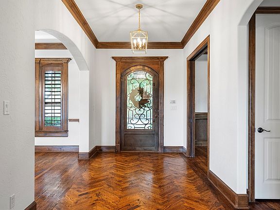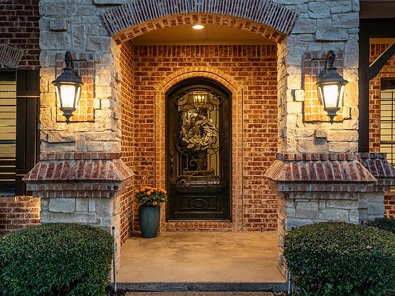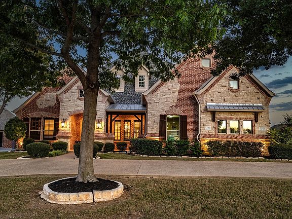 Timeless craftsmanship and modern updates combine beautifully in this custom home nestled within the sought-after Country Club Village community, located in top-rated Argyle ISD. Thoughtfully designed for both comfort and function, the floor plan features four bedrooms on the main level plus a private guest suite with full bath upstairs - ideal for multigenerational living or visiting guests. A circular driveway and three-car garage add convenience and impressive curb appeal. Inside, you’ll find hand-scraped hardwood floors, plantation shutters, encased windows, crown moulding, and updated light fixtures throughout. Fresh paint on the main level gives the home a light, inviting feel. The private study with coffered ceiling, built-in desk, and bookshelves provides the perfect work-from-home space. The spacious living room features a stacked-stone gas fireplace and custom built-ins, opening seamlessly to a chef’s kitchen complete with new quartzite countertops and backsplash, 6-burner gas cooktop, double ovens, a large island, and a butler’s pantry with appliance cabinet for extra storage. The primary suite offers a luxurious retreat with dual vanities, an oversized jetted tub, and a super-sized shower with dual shower heads and bench. A back staircase leads to the second floor, where in addition to guest suite you’ll also find a game room, media room, and wet bar - ideal for entertaining - with new luxury vinyl plank flooring on the stairs and throughout the upper level.