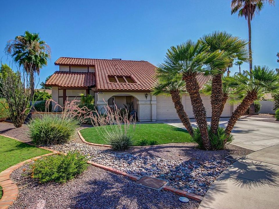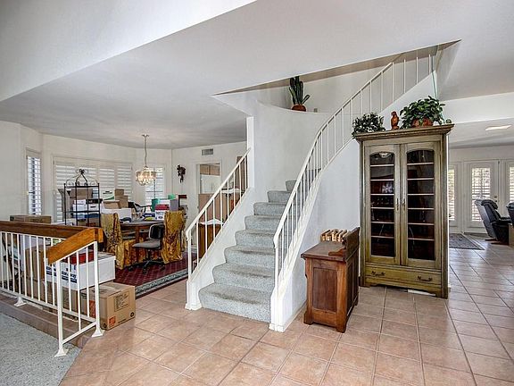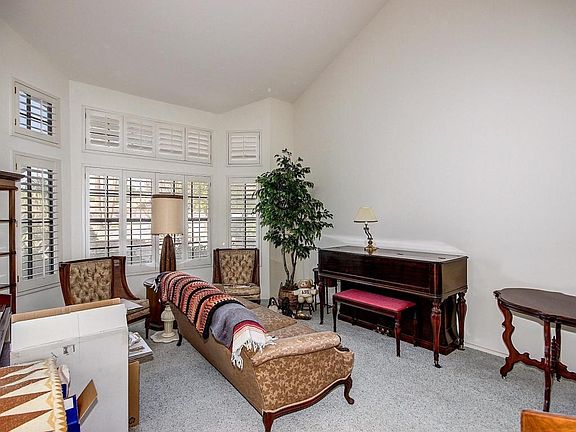 Large 4 bedroom, 3 bath home located within a cul-de-sac on the largest lot in the subdivision. Double door entry opens up to formal living and dining room with vaulted ceilings. Plantation shutters throughout home. Large kitchen boasts dual ovens, garden window, pantry and wet bar. Kitchen opens up to family room featuring a brick fireplace. 1 bedroom located downstairs perfect for guests. Downstairs bathroom with outside access to backyard. Laundry room with cabinet storage and sink. Spacious master bedroom with a balcony and great views. Ensuite features walk-in closet, dual sinks, vanity, separate shower and tub with private toilet. Backyard oasis! Oversized covered patio over looks crystal blue pool and spa.