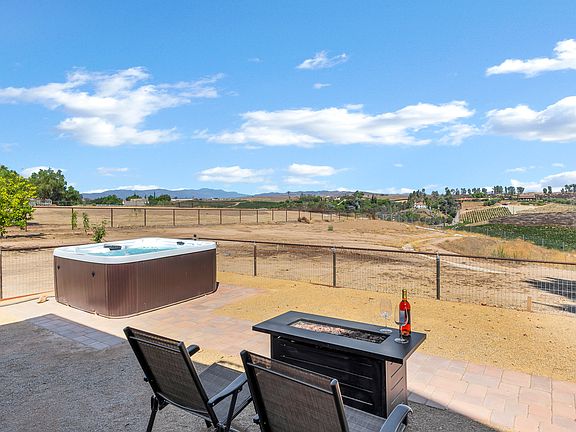 Welcome to this Modern Farm House in the middle of Temecula Wine Country! This is a furnished home offering 30 to 90 night stays. All is included as far as furnishings, kitchen tools, TV's, utilities and even a hot tub! Are you traveling in the area for an extended stay? Or maybe in between homes? Casa Celeste is a wonderful choice that has all the comforts of home and more, conveniently located within just minutes to all wineries as well as right close to the boarder of the City of Temecula! Just quick trips to the stores and 10/15 minutes to the freeway. The home has been tastefully decorated with comfort & style in mind! The basics are all here to get you started. The best part of Casa Celeste is the breathtaking vineyard views seen from all around the home! Casa Celeste does require a minimum of a 30 night stay but can be flexible, no long term leases available. The home includes all furnishings, utilities, wifi, hot tub with weekly services and landscaping. The home is close to 2000 sqft with 3 bedrooms and 2.5 bathrooms. One of the secondary bedrooms is an additional loft space that has a fold out couch that could offer as a 4th bedroom area for sleeping or additional sitting area. Ideal for 2-4 people. Enter in and you greeted with original oak flooring that leads you back to the Great Room & Formal Dining. The best part of these rooms is the large French doors that lead out to an expansive wrap around deck. From the deck you feel a sense of peace as you gaze over popular Temecula Valley Winery Vineyards such as Bel Vino Winery, Miramonte Winery, and Callaway Vineyard & Winery. The kitchen is also right off the Entry with black granite tile counter tops and stocked with all appliances, pots, pans, plates and silverware ready to whip up your favorite meals or snacks! The kitchen does include double ovens, electric cook top, side by side refrigerator, dishwasher, microwave and a sink with a window full of vineyard views. Full Laundry Room located on the 1st floor with washer, dryer, built in ironing board along with tons of cabinets! The 1st floor also has a modern farmhouse powder room. Don't forget to go in the garage and play a game of pool on the pool table or a round of darts! There is tons of parking available. Garage attached the home is used as a game room. Travel up the wrought iron stair case to the 2nd floor. The 1st secondary bedroom with a queen bed also has been extended to have an extra family room area that has a fold/out sofa bed comfortable for 1 adult and can acts as a 4th bedroom as it has a door to close for privacy. The 2nd secondary bedroom is right next store and also has a queen bed. These 3 bedrooms share a hall bathroom with a shower that does have double shower heads! The Primary Suite is also located on the 2nd story and has an ensuite bathroom with separate tub & shower. The Primary Suite also offers a private balcony that over looks the valley of vineyards. The property is located on slightly over 2 acres and is fully fenced. Guests staying can enjoy the harvest of many fruit trees such as avocado, grapefruit, apple and even berry vines growing on the property! Casa Celeste is a the perfect choice to when just looking for short extended stay.