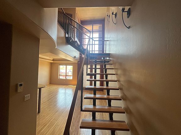 This is THE PLACE at Nob Hill for exceptional contemporary condo living! This home features soaring ceilings, solid hardwood floors, designer kitchen with upgraded appliances, granite countertops, and dining area that opens to a sweet balcony. The open concept kitchen joins a spacious living area perfect for relaxing or entertaining. The stunning cantilevered staircase leads to the primary suite (with another balcony) and an ample 2nd bedroom/office. Spa-like Primary bath with double sinks separate shower and soaking tub. Includes 2 car tandem garage in addition to 2 spaces in the underground parking area. Community outdoor deck with a grill overlooking the Sandia mountains. Enjoy walking to many excellent restaurants and shopping including the co-op grocery. Enjoy low maintenance living and all this historic area has to offer!
