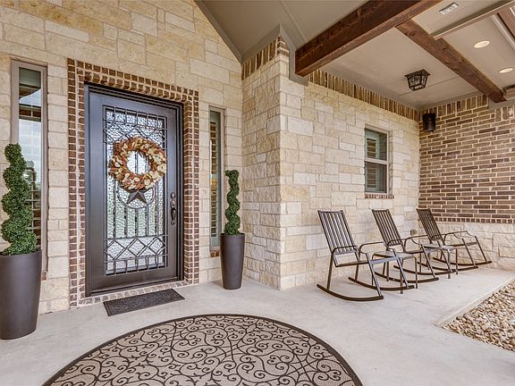 Inside, natural light pours through plantation shutters as warm wood beams, soaring ceilings, recessed lighting, and crown molding elevate the open-concept design. Wood-look porcelain tile flows throughout, creating a seamless, luxurious feel. The heart of the home is the spacious living area, anchored by a dramatic floor-to-ceiling electric fireplace with remote. The entire home, including both porches, is wired for surround sound—ideal for gatherings and cozy evenings. The gourmet kitchen features solid knotty alder cabinetry, granite throughout, a walk-in pantry, double ovens, gas cooktop, stainless vent hood, and a large stone island perfect for entertaining.