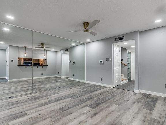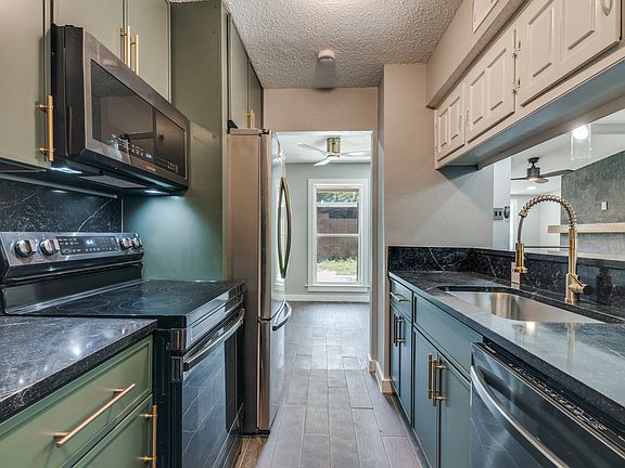 This fully updated 4-bedroom, 2-bathroom townhome offers style, space, and convenience in a fantastic Garland location. With over 1,500 square feet of beautifully finished living space, this home features a versatile layout. The renovated kitchen includes sleek black granite countertops, modern cabinetry, and stainless steel appliances. Gold hardware and a designer faucet add a high-end touch. The living areas feature durable wood-look flooring and fresh paint throughout. A stunning accent fireplace wall with a natural wood mantle brings warmth and character to the main living space. All bedrooms are generously sized with modern ceiling fans, large windows, and updated flooring. Both bathrooms have been fully remodeled with tile surrounds, upgraded vanities, and matte black fixtures. The private fenced yard offers a tiled patio, perfect for entertaining or relaxing outdoors. A one-car detached garage provides extra storage and secure parking. With thoughtful design choices and quality upgrades throughout, this home is move-in ready and sure to impress.
