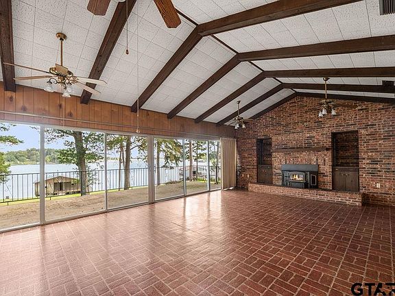 Welcome to your dream lakefront getaway! Nestled on three spacious lots totaling .3 acres owned and an additional .3 acre leaseback, this beautifully maintained brick home offers panoramic water views and an incredible lifestyle right on one of the most desirable parts of Lake Holbrook. Step inside the 1,850 sq ft home and be captivated by the massive living room featuring a cozy fireplace and wall-to-wall glass sliding doors that open to a large patio—perfect for enjoying sunrise coffee or sunset wine with breathtaking views of the water. Underneath the elevated patio is a workshop and greenhouse, ready for hobbies or storage. This thoughtfully designed 2-bedroom, 2-bath home has new carpet in the bedrooms, a metal roof, and a 2-car carport. Attached to the carport is a bonus 400 sq ft space ideal as a laundry room, craft room, or storage with a FULL bathroom—the possibilities are endless. Outdoor enthusiasts will fall in love with the 30’x50’ boathouse, with two separate workshops within the boathouse, and 2 boat lifts. - Located down the driveway to the right of the home that leads directly to the water. The 150 feet of shoreline offers ample space for fishing, boating, and relaxing. The property is well-landscaped and meticulously maintained, featuring a fenced dog run with a convenient ramp to the carport, making it a true retreat for every member of the family. Located in Alba, Texas, within the highly regarded Alba-Golden ISD, you're just 45 minutes from Tyler, 1 hour to Longview, and only 1.5 hours from DFW—close enough for convenience, far enough for peaceful lake living. This is the kind of property that doesn’t come around often. Whether you're looking for a full-time residence, weekend escape, or vacation rental opportunity—this one checks all the boxes.