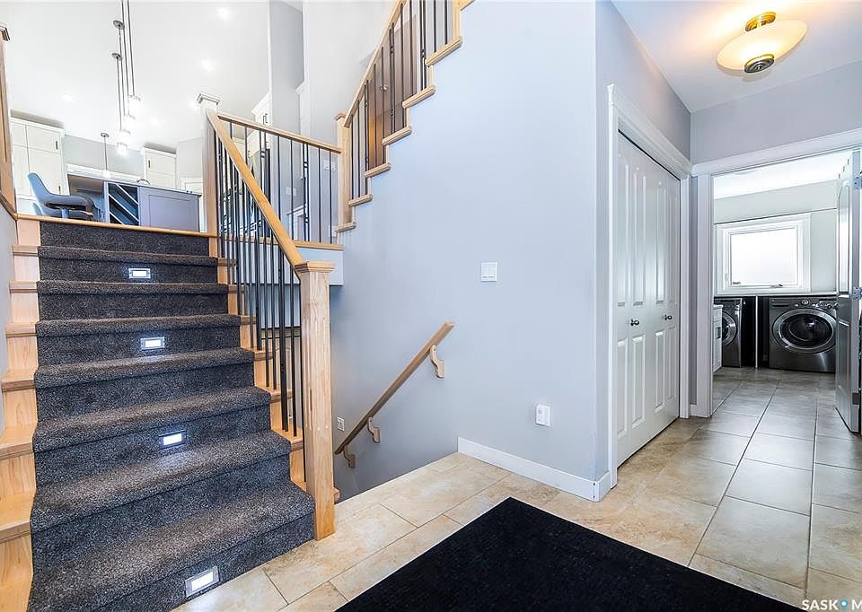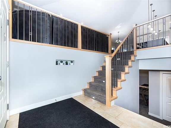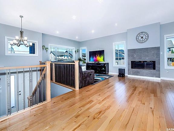 From the moment you step inside, a bright and welcoming foyer invites you toward a thoughtfully designed main floor, complete with a mudroom and laundry area for everyday convenience. At the heart of the home, a chef-inspired kitchen commands attention—anchored by an impressive 10-foot quartz island with a dedicated prep sink (total 3 sink in kitchen), bringing the total to three sinks for effortless workflow. Premium touches abound, including soft-close cabinetry, double wall ovens, an undermount sink perfectly positioned beneath a yard-facing window, a functional desk niche, and the ingenious built-in Vroom kitchen vacuum system. Soaring cathedral ceilings and rich hardwood flooring frame the open-concept great room, where a gas fireplace creates an inviting focal point. The adjoining dining area—custom-designed to host large gatherings—flows seamlessly onto the deck, merging indoor and outdoor living. Two generously sized bedrooms and a full 4-piece bath complete this level. Upstairs, the private primary retreat is a sanctuary of luxury, featuring a spa-inspired ensuite with a Jacuzzi tub, a glass-enclosed tiled shower, dual undermount sinks, ample storage, and an expansive walk-in closet with built-in laundry chute. The bright, fully developed lower level offers extra windows draws lots of daylight, an electric fireplace, and a spacious family/rec room ready to adapt to your lifestyle—whether it’s a games area, home theatre. Two additional bedrooms and a third full 4-piece bath ensure comfort for family and guests alike. Every detail has been considered, from custom closet organizers in each bedroom to stair lighting, central air, a heat recovery ventilation system, and a full central vacuum with a Vroom in the kitchen, rental alarm system for security. Outdoors, a fully fenced yard with patio and lush green space sets the stage for summer entertaining or peaceful evenings under the prairie sky. Close to School and easy access to highway 16.