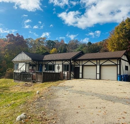Opportunity Knocks! This expanded ranch is brimming with potential and ready for your personal touch. Situated on a prime corner lot totaling .54 acres plus an additional adjoining lot this property offers space, flexibility, and an exceptional location. Inside, you'll find hardwood flooring, beamed ceilings, and an open layout that invites creativity and customization. The expansive deck provides a perfect setting for outdoor entertaining or relaxing while enjoying the surrounding landscape. A two-car garage adds convenience and extra storage. With some TLC and vision, this home can be transformed into the perfect retreat or a valuable investment opportunity. Being Sold Strickly As Is.