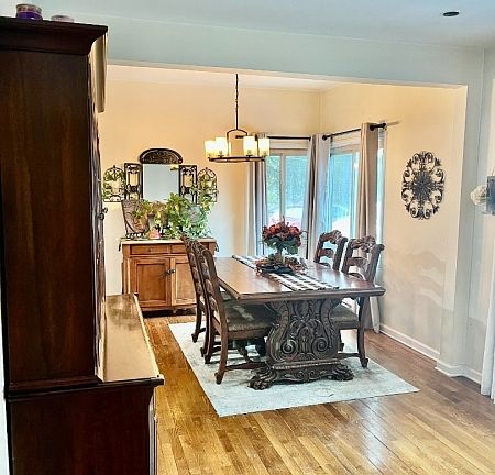 Beamed ceilingsSurrounding landscapeCorner lotOpen layoutHardwood flooringExpansive deck