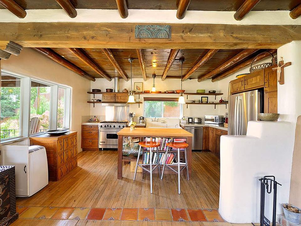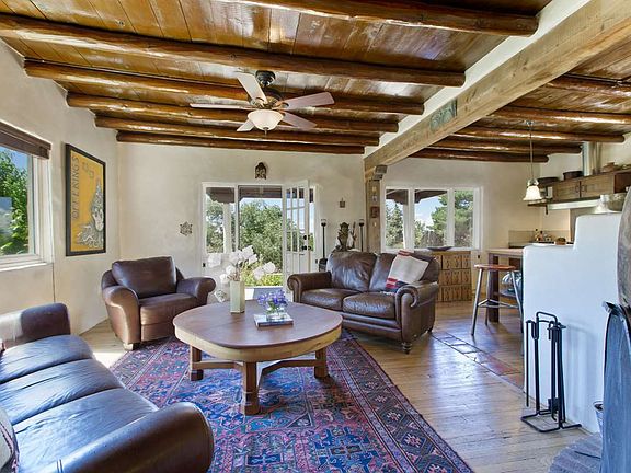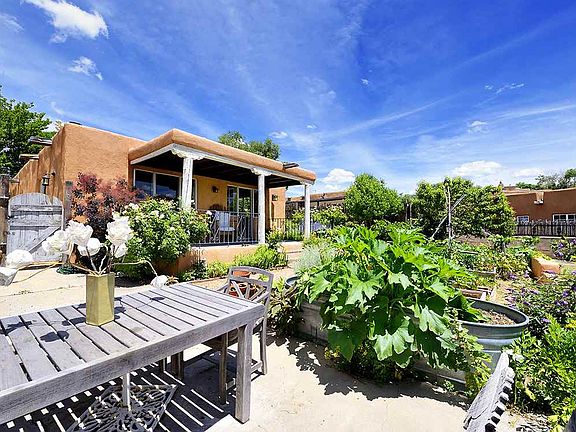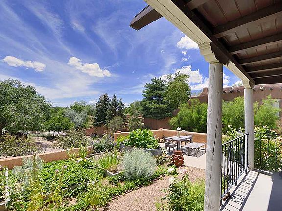 Behind Adobe Walls---With views of the downtown area and the Sandia mountains, the romance of Santa Fe is captured beautifully in this 200-year-old renovated adobe. With authentic mud plaster, deep double adobe walls, coved viga ceilings and the hacienda-like essence of times gone by, one experiences a property that is contemporized, yet has maintained the historical authenticity of its time. 2200 sq. ft. with 3 bedrooms, 2 baths, 2 living areas, a formal dining room, 3 kiva fireplaces and an outdoor living area with gardens, views and an easy stroll to the Plaza. A work of art.