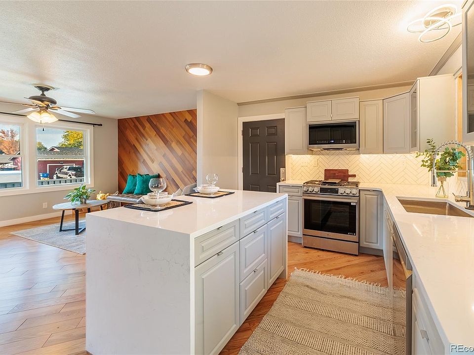 Gleaming gorgeous quartz countertops with luxury waterfall edges, including on the eat-in at the island. The new cabinetry includes ample storage with built-in pantry cabinets, sleek drawer pulls, glass door fronts, and under-cabinet lighting. Deep single-tub sink, with integrated cutting board. Designer Hardwood Feature wall in the living room. New oak flooring and carpet. New designer LED lighting. 3 bedrooms upstairs. The primary bedroom has a private ensuite bathroom, updated with a frameless shower surround, zero-threshold entry entry and a waterfall shower head. Harwood stairs lead to the finished basement. Downstairs, you'll discover a versatile bonus area that could be a bar for entertaining or a great craft/workout space. The family/ rec room features a fireplace. There is a 4th bedroom with egress and a 1/2 bath with a laundry room. All New windows and doors, both interior and exterior, new paint inside and out. Newer roof. New concrete extra-wide driveway and extended rear patio.
