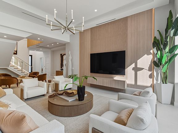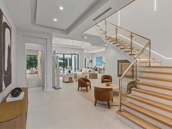From the moment you step inside, it's clear this is no ordinary Mizner Park residence. A grand foyer, an impressive executive office, and a true first-floor primary suite set the tone for a home that feels equally extraordinary whether you're enjoying a quiet evening in or hosting an unforgettable night with friends. Sunlit interiors blur the line between indoors and out, yet retain an inviting warmth--perfect for a cozy movie night with candles glowing and slippers on. Thoughtfully designed for both everyday living and elevated entertaining, the home offers five ensuite bedrooms, including a sumptuous first-floor primary. Upstairs, four grand suites surround a spacious secondary living area, ideal for guests, family, or a private retreat. The open-concept great room flows -- seamlessly into the dining area and designer kitchen, outfitted with Wolf and Sub-Zero appliances and supported by a fully equipped secondary prep zone with extra refrigeration, a second sink, and expansive wine storage.