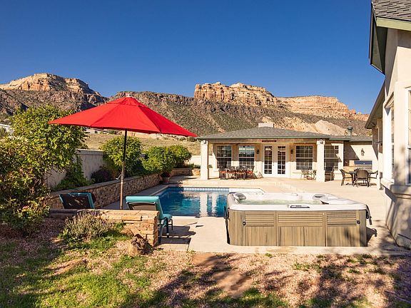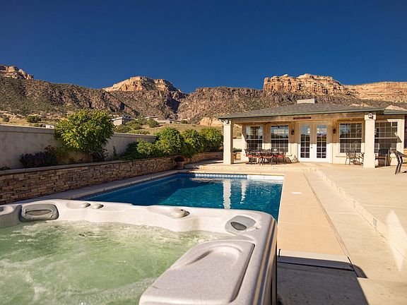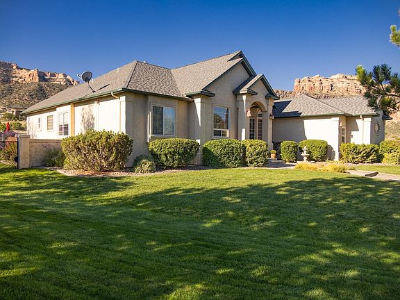 Welcome to your dream home! This luxurious property offers an exceptional lifestyle with incredible views and resort-style amenities. Boasting over 4,000 sq. ft of living space, this home features a pool, hot tub, and a guesthouse/pool house that is perfect for hosting guests. As you step inside the beautiful entry, you are greeted by an elegant dining room and custom wood flooring. The main living area is spacious and open, offering plenty of room for entertaining. The living room features large windows that offer stunning views of the Colorado National Monument and surrounding landscape, with larger acreage properties to the south. The wonderful updated kitchen is built for entertaining, with bar seating, a large eat-in kitchen area and access to the patio. The primary suite is a private retreat, featuring a large bedroom with beautiful views and an area for relaxing, plus an updated bathroom, and a roomy walk-in closet. Additional bedrooms and bathrooms are spacious and well-appointed. For those who work from home, this property also features a private office that offers a quiet space for concentration and productivity. The basement level offers a home theater and game room with wet bar and an additional bedroom and bathroom. The outdoor living spaces are just as impressive as the interior, with a sparkling pool that is perfect for fun in the sun. The hot tub provides a relaxing oasis with incredible views for soaking after a long day or take a steam shower in the pool house. The covered patio and outdoor kitchen are ideal for al fresco dining and entertaining guests. There are also raised garden beds, a fire pit, and a putting green within the private, secure, walled backyard filled with mature landscaping. The oversized two-car garage and generous driveway give you room for vehicles and storage. This property is situated in a desirable neighborhood on a cul-de-sac, and is close to schools, trails, and shopping. Don't miss your chance to own this stunning home and enjoy the luxurious lifestyle it has to offer!