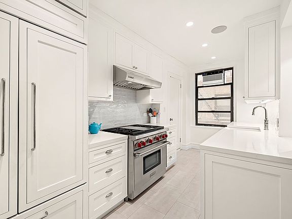 A gracious foyer welcomes you and leads to a spacious living room facing north onto a quiet and peaceful, BUS-FREE section of West 86th Street. A peninsula design-island concept has been created with a continuation of the quartz countertop wrapping around and attaching to the wall of the dining room. The windowed chef’s kitchen features Custom Hanssem Cabinetry, 36" SubZero Refrigerator, 36" Wolf 4 burner Stove with griddle, 36" Vented Wolf Hood, Miele D/W, Miele stacked W/D, Farm Sink, Quartz Countertops, and Porcelain Floor Tiles. The wall between the living and dining rooms has been removed creating an expansive and generous open living space. The extra wide living room with 2 oversized windows, has a custom built-in wall unit with designer lighting. Both spacious bedrooms are pin drop quiet and have excellent closets with custom built-ins. The king size primary bedroom has a renovated en-suite windowed bathroom with tub. The 2nd bathroom has a stall shower with glass enclosure and both bathrooms have exquisite custom handmade designer tiles.