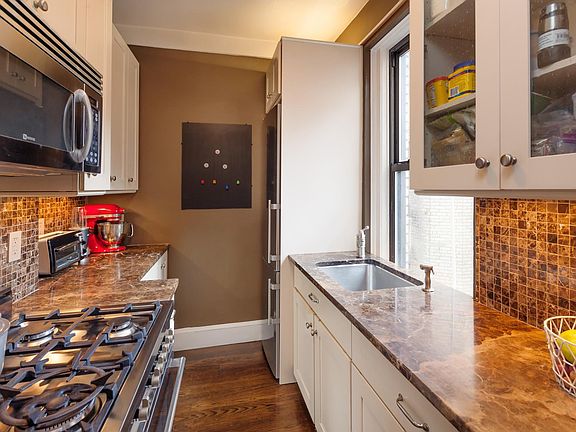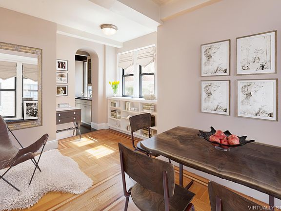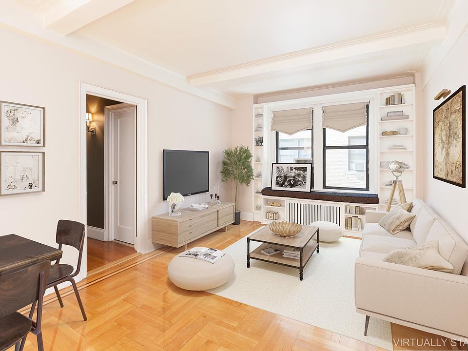 Spacious and elegant corner prewar on one of the loveliest blocks of the Upper Westside!Quiet & bright with full southern exposure, this attractive home has a beautifully renovated windowed chef's kitchen, large open living/dining area with double exposures, original hardwood parquet flooring, 9' beamed ceilings and attractive built-ins. Enjoy a full sized bedroom with a wall of custom closets plus an additional fully fitted, oversized walk-in off the hallway. Bright-quiet-pristine, this home is loaded with charm and character. Boutique 1929 Co-op located in a top-notch Upper Westside neighborhood steps from Riverside Park, all transportation and a myriad of shops and services on upper Broadway. Elevator building. Pets welcome! Pied a terres considered. Please note, the property has been virtually staged.