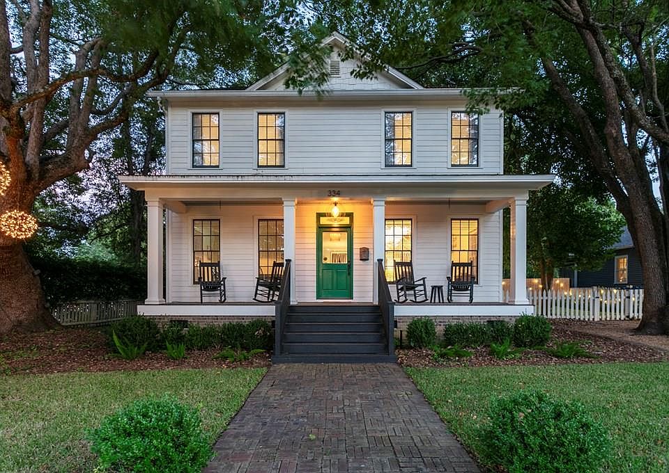 Rocking chair front porchReclaimed heart pine flooringNeighboring porchesCanopy treesGas stove