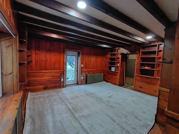 Rustic Living Area: A warm, inviting living room featuring classic wood-paneled walls, exposed ceiling beams, and plenty of built-in shelving for books or decor.