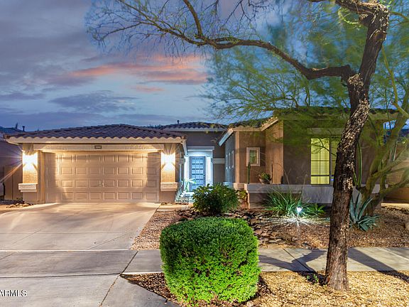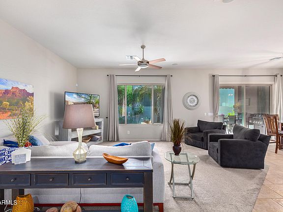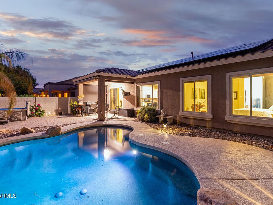 This home has it ALL! Single story with 4 bedrooms, 2 bathrooms, 3-car tandem garage, sparkling blue POOL & solar! New A/Cs, new windows, new slider, retractable patio shades! From the moment you walk in, you'll feel right at home in this impeccably maintained property with a light, bright open kitchen, extended island, ample staggered white cabinets, new refrigerator, new dishwasher. The 1941 square feet has a functional, open layout & no wasted space. A true split floorplan, the primary bedroom is separate from the three guest bedrooms. New carpet! Even the garage is fancy, brand new epoxy! Conveniently located in Tramonto, this master-planned community has community pools, tennis courts, children's playgrounds, miles of trails & more!
