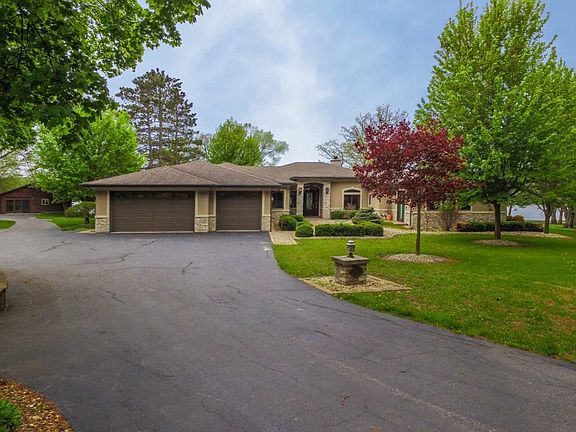 Exquisitely designed and crafted riverfront estate on 6 acres awaits your perusal. The 1/4 mile wooded entrance opens to an expansive compound with breathtaking views of the Rock River while offering maximum privacy! A charming 1 BR knotty pine cabin and log boat house complete the idyllic setting. The foyer flanked by art niches leads to a massive great room with soaring 12 ft. stone fireplace, custom built ins, coffered ceiling and walnut floors. A formal dining room, wet bar and breakfast area all face the river! The gorgeous kitchen features granite counters, travertine backsplash, 8 ft. pantry, wine fridge, stainless appliances and triple sink. Other features include a large media room, spacious office, custom window coverings, unique ceiling fans and state of the art lighting and music systems. A magnificent master suite highlights the river views with a sitting area and fireplace leading to a luxurious master bath. The 3 additional bedrooms have ensuite baths. Come take a peek!
