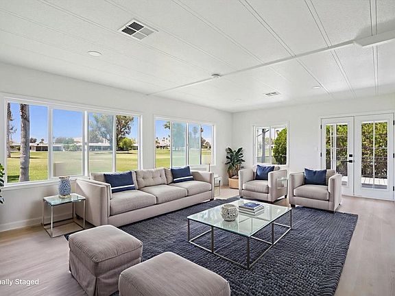 Fully Remodeled with Gorgeous Golf Course & Mountain Views! Enjoy stunning views from the open-concept living, kitchen, and family rooms -- all oriented to capture sweeping vistas of the golf course and mountains beyond. French doors in both living and family rooms lead to a spacious patio, perfect for relaxing or entertaining. Inside, this beautifully updated home features luxury vinyl flooring, energy-efficient dual-pane windows, quartz countertops, recessed lighting, and stainless steel appliances. The primary suite boasts a private bath with an oversized walk-in shower and dual vanities. A well-appointed guest suite includes a walk-in closet and access to a stylish hall bath. Convenient indoor laundry area, covered carport with a dedicated storage room, plus an additional storage shed. Best of all -- you own the land, with low annual HOA dues! Located in Tri Palm Estates & Country Club, a vibrant 55+ community offering unlimited golf for two deeded owners on both an 18-hole executive course and a 9-hole par 3 course. All for low monthly membership monthly fee. Additional amenities include two pools and spas, tennis and pickleball courts, putting greens, shuffleboard, and a clubhouse with dining, lounge, and year-round social events. Just minutes to Costco, Sam's Club, Home Depot, and local dining. Easy access to I-10, Agua Caliente Casino, Acrisure Arena, and the shops of Rancho Mirage and Palm Desert. Plus, the property is within IID electric service territory -- for lower utility costs!