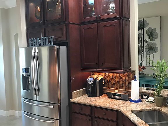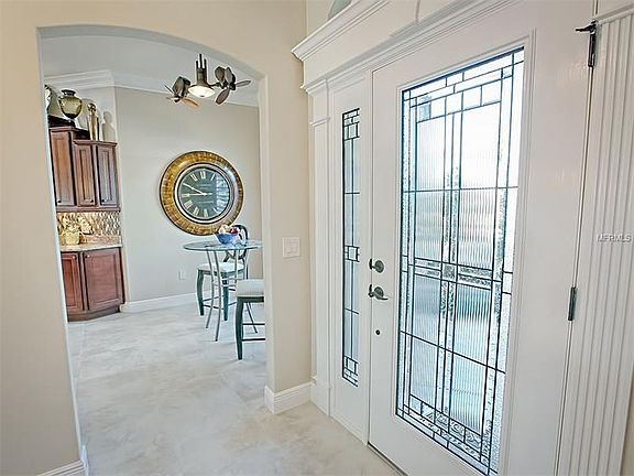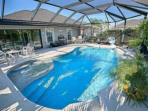 The BOND is PAID on this SPECTACULAR 3/2 Designer with a GOLF CART GARAGE in the VILLAGE OF CHARLOTTE! Positioned on a beautiful cul-de-sac street, this home offers a private, tropical retreat complete with a luscious SALT WATER POOL! This STUNNING home features custom woodwork throughout, with CROWN MOULDING and CUSTOM CASEWORK highlighting the many architectural details!! A distinctive STACKED STONE FIREPLACE is a beautiful focal point in the living area and features a stylish FIREPLACE and built-ins for electronics. The kitchen has rich cherry cabinets with GRANITE counters, unique tile backsplash, upgraded STAINLESS appliances, and TILE flooring.Pendant lights provide stylish accents over the breakfast bar! The living and dining rooms are spacious and have tile floors throughout (no carpet in this home!) The large master bedroom features warm, wide plank flooring, and opens to the master bath which has split dual vanities, and tiled ROMAN SHOWER. The double master closets are custom designed with built-ins. The guest area has two spacious bedrooms, (both with closets), and a guest bath with a GRANITE vanity and a tub/shower with custom glass enclosure. French doors open from the living area to the spacious lanai which offers a separate heat/air system, and soothing views of the pool, lush landscaping and the open-air pergola! This is a JAW-DROPPING GORGEOUS home with more upgrades than room to list! All this in a super-convenient Villages' location! And the BOND IS PAID!