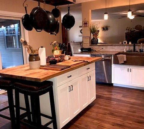 Wait until you see this newly remodeled kitchen that is absolutely stunning! It opens up into a 21x28 family room with a wood burning fireplace to spend those cold evenings ahead. The laminate scraped wood flooring was installed in 2017 in the hallway, kitchen & family room. Newly installed garage door '19, brand new water line from the house to the street '18, additional outlets were added in the garage '17, sump pump '14, well pump '09, patio & overhead covering '07, plumbing, water heater, fuse box to a 200 amp service, water softener '06. All new flooring w/drain, so that the sump pump is re-routed down through the crawl space& out. Installed a chain link fence '04. Furnace/Heat pump '03, Updated 2 baths '02.