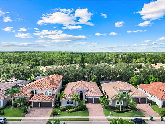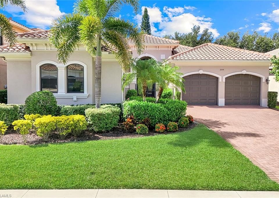 Step into timeless elegance with this Mediterranean-inspired residence in the highly sought-after Riverstone community of Naples. Upon arrival, you'll notice the beautifully maintained exterior, the stately barrel tile roof, arched windows, 3-car garage and paver driveway framed by tropical landscaping. The covered portico with fluted columns and double glass entry doors crowned by an arched transom window sets the tone for the luxury within. Inside, an open-concept floor plan welcomes you with soaring tray ceilings, wall of glass doors, and designer finishes that bathe the home in natural light. The expansive great room seamlessly flows into the dining area and chef’s kitchen, making this home ideal for both intimate evenings and large gatherings. The immaculate kitchen is anchored by an oversized single-basin undermount sink, designed for effortless prep and clean-up with a seamless modern look. Additional features include quartz countertops, stainless steel appliances, abundant cabinetry, and a spacious center island. A cozy dining/cafe nook framed by windows overlooks the private backyard retreat. For effortless entertaining, a built-in bar with wine cooler and rich cabinetry connects the living spaces, perfect for holidays and special occasions. The primary owner’s suite is a true sanctuary with elegant finishes, wood-look flooring, a spa-like bath with soaking tub, glass-enclosed shower, dual vanities, and an expansive custom closet. A versatile flex room off the single-car garage offers endless possibilities—ideal as a home office, media room, fitness space, or guest retreat. The dream laundry room provides abundant cabinets, granite counters, a sink, and a door for privacy when needed. The three separate garages all have finished walls, epoxy-style floors, and overhead storage racks—perfect for car enthusiasts, hobbies, or organized storage. Step outside to your private Florida oasis. A covered lanai with a built-in style grill, beverage refrigerator, and dining space opens to a spacious screened patio with multiple seating areas.Designed to highlight the home’s natural surroundings, the picture-frame screen provides a wide, seamless panorama of the tranquil wooded backdrop. Lush landscaping ensures privacy and beauty, creating the perfect setting for morning coffee, evening cocktails, or weekend barbecues. Riverstone is renowned for its resort-style amenities, including a clubhouse with a resort and lap pool, fitness center, indoor and outdoor basketball, pickleball, tennis, and year-round social events. Families enjoy the A-rated schools and splash pad, while all residents appreciate the peaceful, tree-lined streets just minutes from Gulf beaches, shopping, dining, and golf. This gently lived in home blends luxury finishes, thoughtful design, and an unmatched location to deliver the very best of the Naples lifestyle.