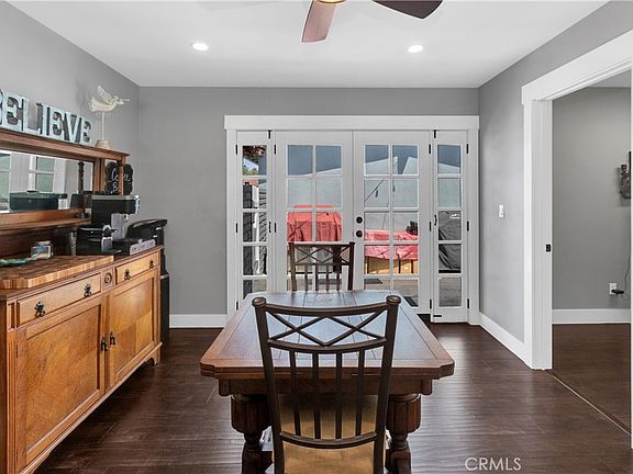 Additional features include dual-pane vinyl windows and stylish blinds throughout the home, offering energy efficiency and comfort. The laundry room is conveniently located indoors with plenty of cabinet space for storage. High-sloped ceilings in the dining area and throughout the home add a sense of spaciousness, while the backyard is ideal for outdoor living, complete with ample sunlight and easy access through the rear French doors.