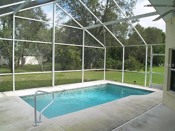 Gorgeous "almost new like" home light and bright with open great room with high ceiling and large sliding pocket door onto pool patio. Modern kitchen features breakfast bar and all the appliances. Master Suite with His & Her vanities and closets and separate shower and garden tub. Sparkling and refreshing screened pool. Has 2 car garage and detached storage shed.. Located close to schools and shopping and around the corner from county recreational center.. Small pets may be acceptable at owner/landlord's discretion. Call today for your private showing.