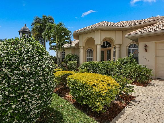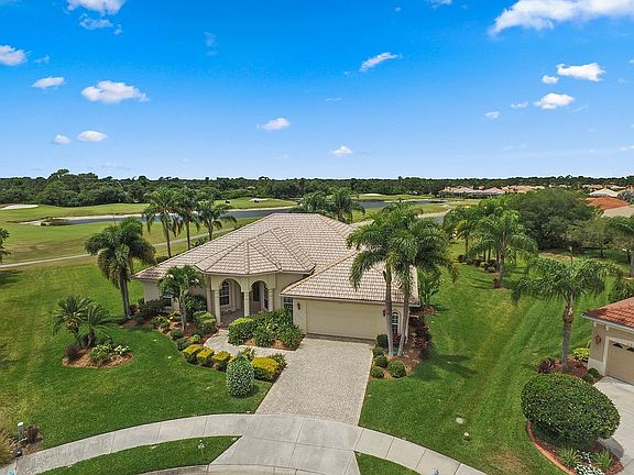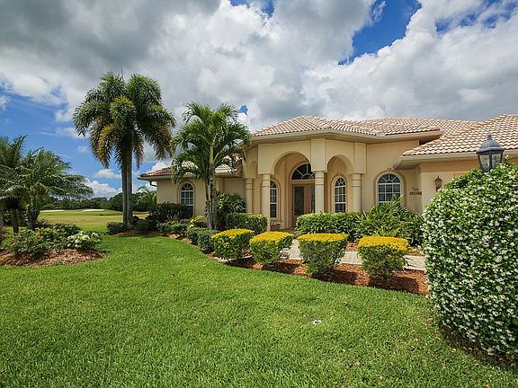 GOLF COURSE, WATER FRONT HOME, 3 BR, 3 bath, 2 & car garage, extra large free-form Pebbletec pool (heated by solar & heat pump), unique water fall, enclosed within a over sized screened lanai. Built in 2004 by Fero Construction, their Bella Trabue Model. This private home, at the end of Bailey Palm sits on a huge acre lot (not including the back 40) located on the 3rd tee of Charlotte Harbor National Golf Course. Home has extensive garden areas with numerous palm, fruit trees and plants. Home interior includes a 14 high Great Room, lighted tray ceilings, custom entertainment center, natural gas fireplace with custom mantel, huge zero corner slider, when opened exposes the large tiled lanai and paver pool area. Home has a formal dinning rm with lighted tray ceiling, reading/office rm, dining nook with lighted tray ceiling including a double 90 degree sliders exposing the lanai & pool area. Kitchen has extensive cabinetry with under counter lighting, 2 pantries, 2 office work stations, all with granite counters tops and is fully applianced with a Double Dutch Oven. Master BR has lighted tray ceiling, zero corner slider opening to the lanai & pool area, its private bath has a Roman Shower, Jacuzzi Tub, his & hers vanities and his & hers walk in closets. Home has a separate laundry room, with a secure closet, cabinets, laundry tub, and shelving. Home has tiled floors with carpeted bedrooms. Most rooms have lighted nitches and shelves for decorations. Pavers are used for drive, walk & entry ways, plus about the pool. Home has a Deluxe Entry, barreled tile roof, accordion sliders for hurricane protection plus Manabloc Plumbing and central vac system. Home has extra storage, cabinets and work shop in garage. Lanai has outside kitchen counter with cabinets. Home includes a deep well lawn irrigation system, 20 foot electric Sun Setter awning for late day setting suns, and a audio system in the Great Room & lanai. Living area is 2617 feet, Total area under roof is 3686 feet. Home includes all window treatments.