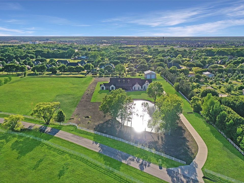 Resort style living! Texas luxury showhome located in top ranked Prosper ISD! Architecturally striking & beautifully appointed, this sprawling custom plan offers quality finishes, unique style and comfortable spaces. Interior features rich woodwork, one of a kind lighting fixtures, and exquisite wood floors. This home is a true entertainer's delight featuring a remarkable outdoor living area - fully designed 600 sqft entertainment area enclosed by two 16ft roll-up garage doors, pool with grotto, and spa surrounded by grass turf. Commercial grade kitchen features top of the line appliances, custom cabinetry and granite counters. Plenty of space to work on your hobbies and projects in the 1800 sq ft spray foam heat and cooled workshop, while endless storage ensures that all your belongings have a place. For your peace of mind, a storm shelter with hidden safe room is also included. Private parking pad with RV hookups next to the shop. Stocked Pond ready for the fisherman in the family!