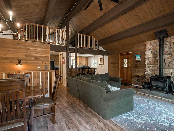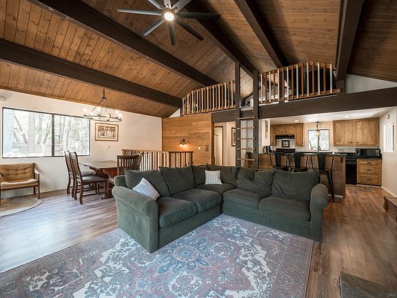 Lovely home in charming Green Valley Lake. This 4 bedroom open floor plan features a loft overlooking the large living room with cathedral ceilings and wood burning stove, a spacious kitchen with a breakfast bar and a beautiful deck surrounded by trees. A great property for short term rental or just to get away for the holidays. 10 minute walk to the village and lake, which has boating, fishing, swimming, hiking, mountain biking with miles of trails. 7 miles to Snow Valley and 20 miles to Big Bear to enjoy some winter skiing. Come and see what all this quaint community has to offer!