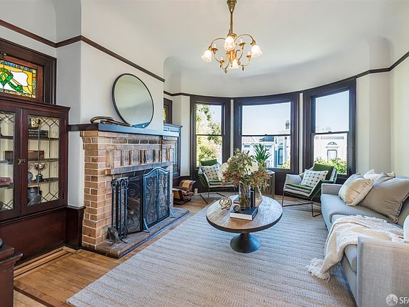 Perched on the prized slopes of Liberty Hill, this elegant Edwardian condo offers a rare combination of vintage charm, thoughtful updates and a functional layout. The top-floor residence in a boutique 3-unit building features three bedrooms, a split bath, and abundant natural light throughout its beautifully proportioned interiors. Step inside to find refined architectural details including ornate woodwork, curved bay windows, and a striking marble and tile front entry that speak to the home's historic pedigree. In the living areas, hardwood floors, fireplaces flanked by built-in bookcases create a warm, welcoming atmosphere that blends comfort with character. The remodeled kitchen includes stainless steel appliances, quartz countertops, pantry area, and a classic vintage stovea perfect mix of old and new. The spacious front bedroom featuring two large closets and period details. Two additional bedrooms are tucked quietly at the rear, use as 3 generous bedrooms or 2 plus family room. A split bath features stained-glass windows, a shower over clawfoot tub. Convenient laundry room with SxS washer & dryer + extra shelving. A large, deeded storage room overlooks shared rear yard, makes a perfect work retreat, hobby space & bike storage. One car transferable leased parking garage.