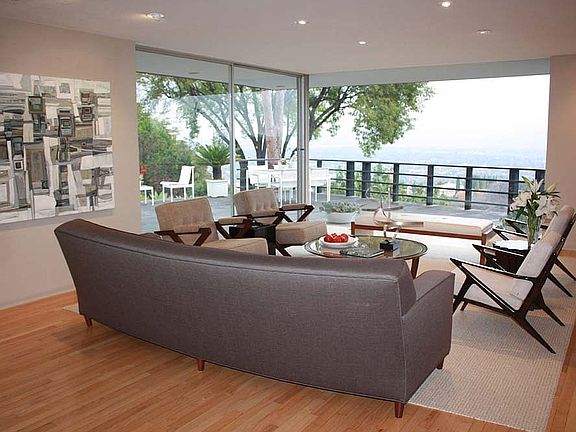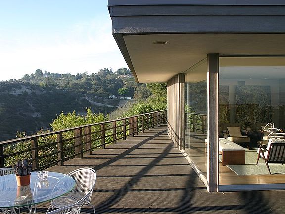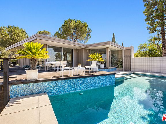 Architectural home with staggering views on a serene ridge off Mulholland Drive. The 1965 Hershel Daugherty House by architect Frank Burton Wilson is an exquisite mid-century modern home with frameless walls of glass, block walls, post and beam spider legs, terrazzo floors and a seamless connection of indoor/outdoor spaces. Drought tolerant landscape harmonizes with the surrounding hills. Enormous wrap-around deck and architect-designed pool allow for large-scale entertaining on this estate sized lot with panoramic views in every direction. Luxurious primary suite offers a sleek bath and walk-in closet. There are two additional bedrooms, plus an office. A large guest house with bath and walk-in closet complete this sprawling compound. 2-car garage