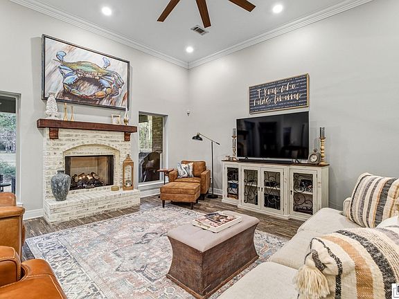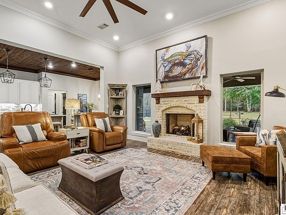 This 1.5-story, three-bedroom home opens up across 2.75 acres, giving you room to live, breathe, and enjoy a little space without feeling removed from everyday convenience. The living room centers around a gas log fireplace, setting a warm tone that carries throughout the home. The kitchen brings genuine function and charm together—generous storage, a welcoming breakfast area, quartz countertops, under-cabinet lighting, and matching KitchenAid dishwasher and stove/oven that elevate the everyday experience. The primary bedroom offers its own sense of retreat with a walk-in closet, a soaker tub, and custom tile work in the walk-in shower. The guest bath carries the same attention to detail with custom tilework around the tub/shower combo. Flooring throughout the home ties everything together: porcelain tile that resembles warm wood planks covers most of the main areas, while vinyl plank flooring keeps the office/bedroom and upstairs bonus room comfortable and low-maintenance. The upstairs room stretches out with surprising space—perfect for a media room, studio, or a 4th bedroom. Outside, practical perks add real value, including a garage with two remotes and an RV carport ready for extra vehicles or weekend adventures. With acreage, comfort, and thoughtful upgrades throughout, this home lands in that rare spot where practicality meets a bit of breathing room—ideal for anyone wanting something that feels solid, private, and ready for the long haul.