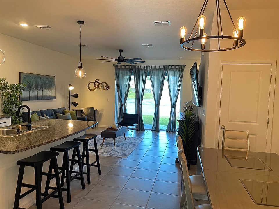 The main level features a beautifully tiled foyer that extends through the living room and wet areas. The kitchen is a standout with its modern cabinets, granite countertops, stainless steel appliances, and a spacious walk-in pantry. The kitchen island includes a breakfast bar, perfect for casual dining and entertaining. From the family room, triple sliding doors open to a private, large, covered lanai, ideal for relaxing, dining, and entertaining outdoors. A convenient half bath is also located on the main level.