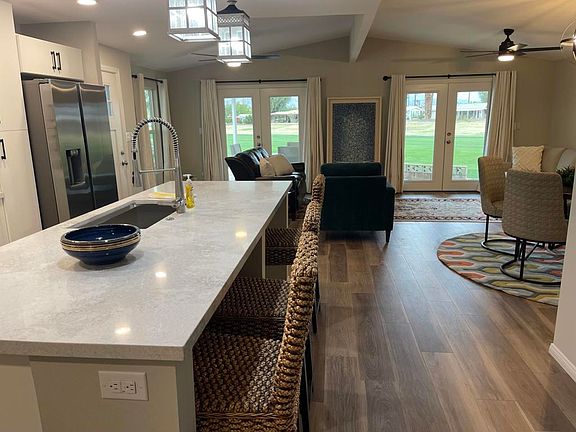 Totally remodeled golf course home. Beautful mountian view from large covered patios, living and dining rooms. Totally open floorplan with the new bright upgraded kitchen as the heart of the home. There are two bedrooms, both en suite, large living, dining with vaulted ceiling and family from with french doors to golf course patios. There is new drywall, plank flooring and dual pane windows throughout. The kitchen has new white soft close cabinets, upgraded stainless steal appliances and quartz countertops. There are LED ceiling fans and recessed LED lighting throughout. The bathrooms have custon tile and all new cabinets and finishes. The master bath has an enormous walkin shower with a bench seat and handled fixture. There are new interior and exterior doors, a half bath powder room, large laundry room with new washer, dryer and stainless steal laundry sink. The master bedroom has a huge walk in closet and a sliding patio door to a private patio. Outside you will enjoy new desert scape drought tolerant landscape with an automatic drip irrigation system. There is so much to offer in Tri-Palms including a clubhouse with restuarant, pool and free golf to two deeded homeowners. This is a quality remodel that doesn't come around often on the golf course with amazing views.