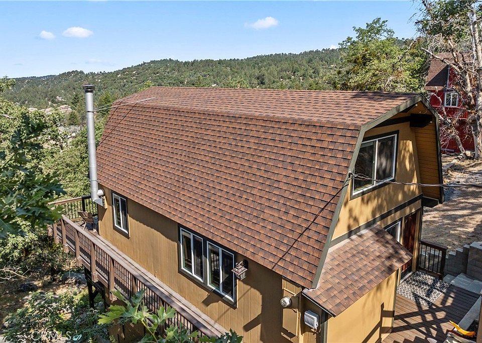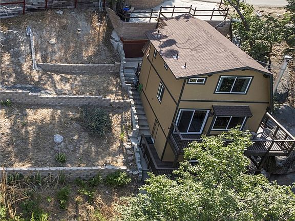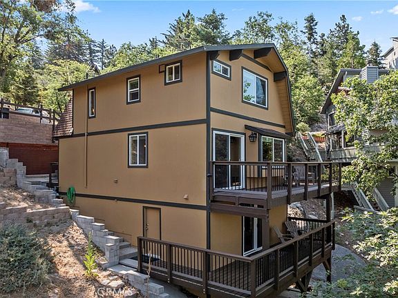Perched on five spacious lots with sweeping views of the San Gabriel Mountains, this beautifully updated 3BR, 1.5BA home offers the perfect blend of mountain charm and modern upgrades. Originally a 2BR/1BA, the home underwent a complete transformation starting in 2018, taken down to the studs and rebuilt with a fully permitted renovation that added a third bedroom and a half bath. Spread across three levels, the thoughtful floor plan offers both privacy and flexibility, making it ideal for hosting family and friends. Throughout the home, you'll find rich Brazilian Cherry hardwood floors, tongue and groove wood ceilings with exposed beams, and new dual-pane windows and sliders that bring in abundant natural light. The main-level entry opens to a chef-style kitchen featuring a large center island, solid marble countertops, undermount stainless steel sink, solid wood cabinetry with soft-close drawers, stainless-steel appliances, and a breakfast bar. The adjacent dining area flows effortlessly into the living room, which is anchored by a wood-burning stove, a charming bay window, and access to the main deck, perfect for taking in the serene forest and mountain vistas. Also on the main floor is a convenient stackable laundry area. Upstairs, 2 bedrooms with vaulted ceilings, remote controlled ceiling fans, knotty Alder wood doors and trim, and a full bath with Italian porcelain tile and a deep soaking tub create a cozy retreat. The lower level hosts the 3rd bedroom and 1/2 bath, along with its own private deck and separate exterior access, an excellent option for guests or a rental setup. Additional features include new exterior paint, durable wood grain cement fiber siding, a tankless water heater, updated electrical and plumbing systems, central forced air heating, generous storage space with a raised platform in the build-up, and a separate sub-basement. Outside, you'll find concrete parking for three cars, stone steps leading to the front entrance, and a covered wood storage crib. Approximately 300 square feet of Trex decking with metal railing accents add to the outdoor appeal. Located on a paved, plowed, and maintained road with full conventional utilities, including gas, this turnkey home is bordered by a seasonal creek that flows through two of the five lots. Just minutes from Snow Valley Ski Resort, scenic hiking trails, and mountain fishing spots, this move-in-ready retreat is an ideal full-time home or weekend getaway.
