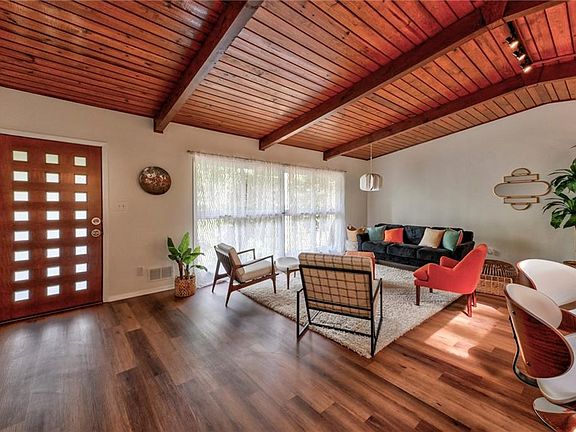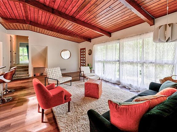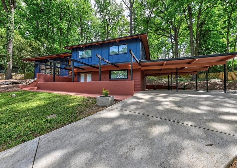 Stunning Mid-Century Modern retreat tucked away in sought-after Northcrest. Thoughtfully refreshed with meticulous detail including new furnace, driveway, sewer line and insulated low-E vinyl windows. Private sloped approach opens to a serene, level fenced backyard, an outdoor sanctuary with mature hardwoods, lush canopy and multiple entertaining spaces including a trellis-covered patio. Inviting front porch with multiple seating zones and pergola accents sets the tone. Step through handcrafted stairs and custom Mid-Century entry to soaring vaulted ceilings with exposed, stained beams and solid-surface flooring. Light-filled family room with exposed brick feature wall and breakfast bar flows into the updated kitchen w/ white cabinetry, stainless appliances, apron-front sink, designer vent hood and breakfast nook with sliding glass doors to the backyard. Split-level layout offers three vaulted-ceiling bedrooms up, including thoughtfully redesigned shared suite-style bath configuration blending style and practicality. Finished lower level offers a second living space with brick fireplace, bar with sink, walk-out access to front patio, full bath and 4th bedroom with great natural light. Two-car carport + additional parking pad. Exceptional privacy yet moments to I-85, shopping, dining and top-rated schools. A rare, true Mid-Century gem.