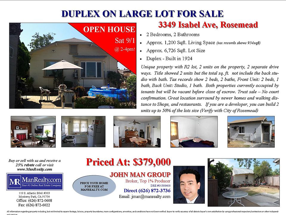 Back on market as of 10/30/12. Unique property with R2 lot, 2 units on the property, 2 separate drive way. Title shows 2 units but the total 954 sq.ft. does not include the back studio with bath. Tax records show 2 units, 2 beds, 2 baths, Front Unit: 2 beds, 1 bath, Back Unit: Studio, 1 bath. Both properties currently occupied by tenants but will be vacant before close of escrow. Trust sale ? No court confirmation needed. Great location surrounded by newer homes within walking distance to Shops and restaurants. If you are a developer, you can build 2 units up to 45% of the lot(Verify with City of Rosemead) **Please do not disturb tenant - drive-by only**