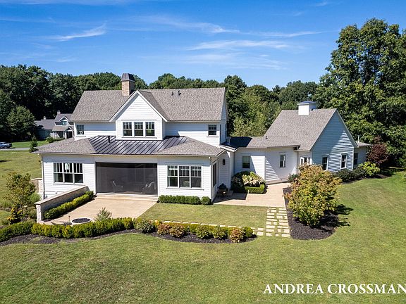 Welcome to this exceptional 4,200+ sq. ft. modern farmhouse offering refined main-level living in The Ravines of Saugatuck, where residents enjoy an Arnold Palmer-designed golf course and an association pool. Built in 2018, this 4-bedroom, 4.5-bath home rests on 1.3 acres, expertly positioned to capture tranquil views of the surrounding woods and pond. The gourmet kitchen showcases Wolf and Sub-Zero appliances, Silestone counters, and a large island, while the walk-in butler's pantry includes a built-in Miele coffee machine and wine fridge. Reclaimed white oak floors flow throughout, including the bright dining room accented by large windows. The living room features custom built-ins and a gas fireplace. The screened patio with retractable screens and a second fireplace offers effortless indoor-outdoor living. The main-floor primary suite is a private retreat with radiant-heated floors, a steam shower, soaking tub, and custom closet. The upper level includes an ensuite bedroom, additional bedroom, den/office, and full bath. The lower level expands the living space with a wet bar, theatre room, exercise room (or optional fourth bedroom), full bath, and generous storage. Outdoor living is enhanced by a spacious patio and tasteful landscaping. The heated 3-stall garage includes a convenient dog wash. Designed by award-winning architects and builders, this home combines timeless design with high-efficiency systems, dual-zone heating and cooling, and an ideal location near Saugatuck's boating, dining, and shopping.