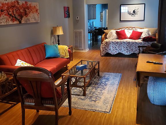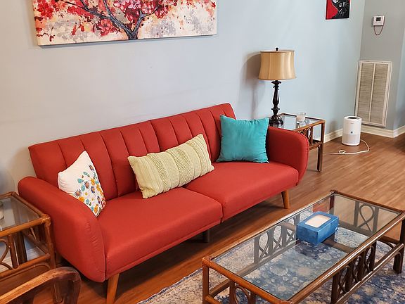 FULLY FURNISHED bungalow WITH ALL UTILITIES AND YARD MAINTENANCE INCLUDED three blocks from the riverfront by Jackson Barracks has a fold-out futon couch in the den as well as an extra daybed for overnight guests, with a queen bed and washer/dryer in bedroom! All utilities, including internet and yard maintenance, included in rent. There is a private fenced yard for fur babies and a dog park in neighborhood. Check out Old Arabi Bar and Arabi Lighthouse book and record store, just around the corner. Also Zeitgeist theatre, Old Arabi Food Store within blocks! Canseco's grocery store and Walmart are also in the area.