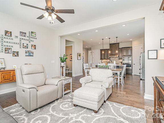 Welcome to 335 Brambling Court in Pinnacle at Wesley Chapel, a vibrant 55+ community where modern living meets comfort and convenience. Built in 2021 and set on a quiet cul-de-sac, this beautifully upgraded home offers 3 bedrooms, 3.5 baths, a large office, and exceptional design tailored for everyday ease and entertaining. The main level features engineered hardwoods throughout, an open layout with a spacious primary suite, complete with a roll-in shower, Closets by Design custom shelving and cabinetry, and framed vanity mirrors for a touch of elegance. A generous office provides flexible space for work or hobbies, while a built-in buffet with abundant storage adds both functionality and a custom feel to the dining area. Plantation shutters and room-darkening Duet shades are installed throughout, providing both style and function. In the kitchen, upgrades include a Bosch dishwasher, super-quiet disposal, a high-capacity hood, and stylish lighting and ceiling fans that enhance the home’s livability. Upstairs offers a true second living space, perfect for guests. It includes a large family room, bedroom, full bath with frameless shower enclosure, and two walkout storage rooms for added convenience.