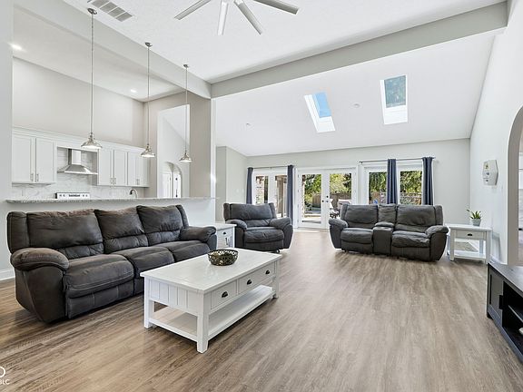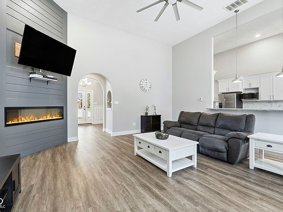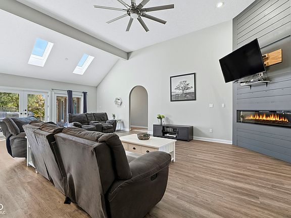 Tucked within one of Danville's most sought-after neighborhoods, this beautifully reimagined brick ranch perfectly blends modern comfort with timeless appeal. Set on over half an acre, the home welcomes with soaring ceilings, abundant natural light, and an effortless flow designed for both everyday living and elegant entertaining. The great room makes a striking impression, anchored by a sleek linear fireplace, skylights above, and expansive windows that fill the space with warmth and light. The open-concept kitchen is equally inviting, featuring crisp white cabinetry, granite countertops, stainless steel appliances, and a farmhouse sink that adds a touch of charm. The primary suite feels like a private retreat with its own cozy fireplace, patio access, and a spa-inspired bath. On the upper level, a spacious loft offers the flexibility for a home office, playroom, or guest suite, tailored to fit any lifestyle. Outside, a private fenced backyard with a generous patio, fire pit, and mature landscaping creates the perfect backdrop for outdoor gatherings. With a three-car garage, thoughtful updates throughout, and a tranquil setting just minutes from downtown Danville, this home captures the essence of refined small-town living, where elevated design meets everyday ease.